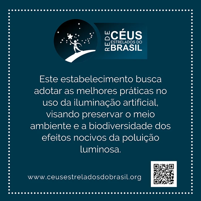A Pousada recebeu um reconhecimento especial da instituição Rede Céus Estrelados do Brasil por adotar práticas de preservação ambiental, especialmente no controle da iluminação artificial. Esse reconhecimento reflete nosso compromisso com a proteção do céu noturno e a redução de impactos ambientais, criando uma experiência autêntica de contato com a natureza e as estrelas.