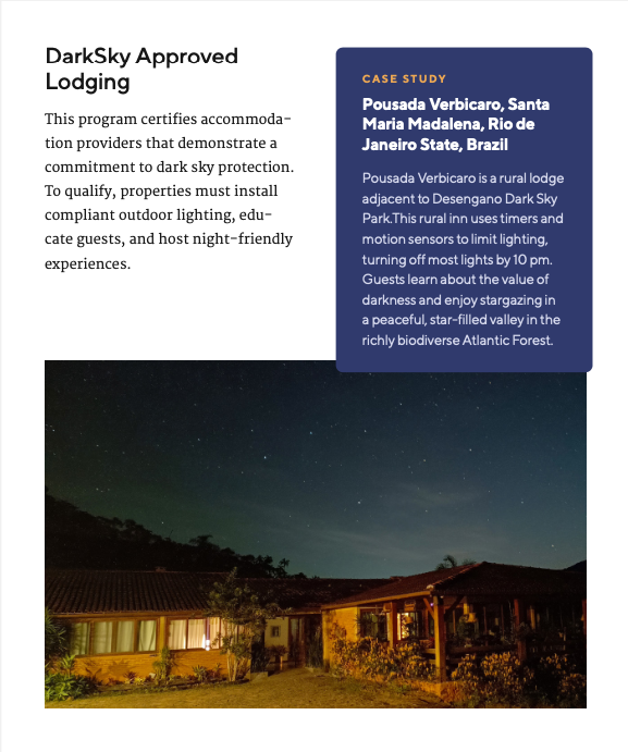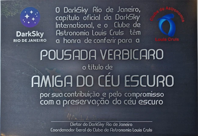 Em reconhecimento ao compromisso da Pousada com a preservação de condições ideais para a visibilidade das estrelas, recebemos o certificado "Amiga do Céu Escuro", concedido pelo DarkSky Rio de Janeiro e pelo Clube de Astronomia Louis Cruls. Esse selo destaca nossa dedicação em oferecer um ambiente onde a beleza do céu noturno é preservada para uma experiência autêntica e inesquecível de observação astronômica.